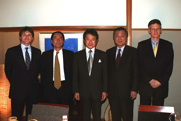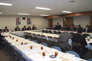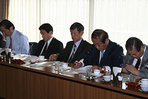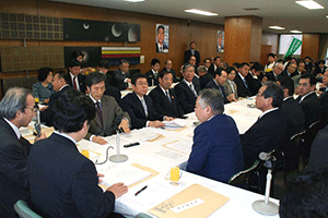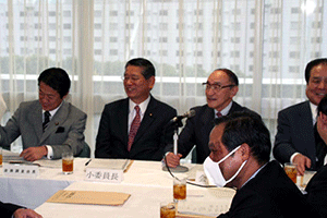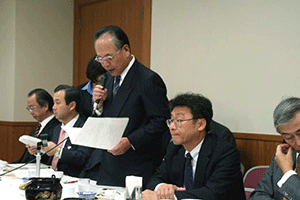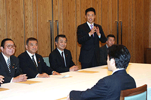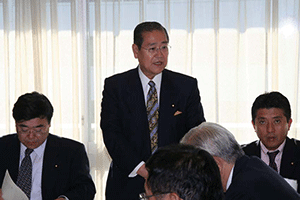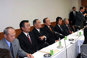 役員連絡会の開会の前に、沖縄県知事選挙で選対本部長を務めた稲峰前知事、当選を果たした仲井真新知事らが報告とお礼のために来訪されました。役員連絡会では中川秀直幹事長から復党問題についてこれまでの経過が報告され、この後は党紀委員会笹川委員長に審議をお願いすることになることが報告されました。
