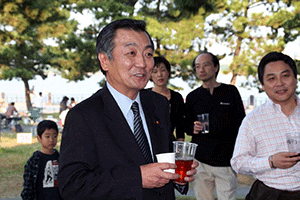 恒例の中区薬剤師会の皆さんの懇親交流会です。今回は金沢区の海の公園でバーベキュウ大会となりました。13:00にお招きいただきましたが日程の都合で到着は15:00でした。皆さんはすでにお酒の酔いも回り盛り上がっていました。藤井基之参議院議員も小田原から県内を縦断しこの会場に到着しました。一息ついて夜のシンポジュウムに備えます。