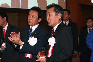衆議院議員薗浦健太郎君のパーティーがマツヤサロンで盛大に開催されました。麻生太郎外務大臣も出席され、総裁選挙のときに候補者随行・広報担当として支えてくれたと感謝の意を表明されました。