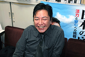 某会館事務所を訪問すると、そこに待ち受けていたのは黒シャツの男。永田町や霞ヶ関の業界では有名な人物で、いつも真っ黒なシャツに黒いネクタイを着用しているサンケイの石橋さんです。顔はかわいらしい造作で憎めないのですが、初めて会ったころは一体どんな素性の人物か分かりませんでした。付き合ってみるとその見識の深さ・広さと先見性の極めて高いことに驚かされます。永田町にはたくさんのマスコミの方が出入りしていますが、いつも真っ黒というのは石橋さんしかいません。人は見かけが9割といわれていますが、見かけにだまされずよく知ってみると信頼のおける好人物だった、というそんな出会いもあると反省させられた好人物です。それにしても、今日は暇なの?