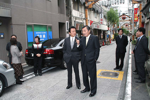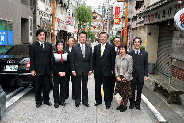 ヒェ〜!なんと麻生太郎外務大臣が私の事務所のある野毛の飲食店街を訪問されました。私のお袋もびっくり。福岡から羽田に着き、うちの近所にあるインターコンチで赤間代議士の結婚披露宴に出席するところ、少し時間があるとのことで20分ほど、自宅兼事務所に家庭訪問です。町の様子を見回して和菓子屋の「もみぢ」さんと「村田 家」さんに目が留まったようで、「昔ながらのいい風情だな」ですって!ひとっこ一人町を歩く人はおらず、静かな(実は地元の野毛2丁目の皆さんは秋の日帰りバス旅行で町には誰もいない)様子に心配されちゃいました。