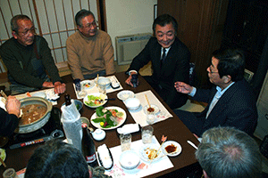 神奈川県議会議員村上健司先生らがメンバーとなる商和会の例会が経費削減とのことから今回は村上事務所で開かれました。経費削減といっても大変です。それぞれの奥様方もお手伝いに入り、台所で準備に大騒ぎです。手作りの心のこもったお料理に皆さん舌鼓。新たなメンバーも加わり和気藹々の会となりました。いや〜、ここでもやはり「復党問題」ですね。皆さんの関心が大変高いことに驚かされます。皆さんの基本的な考え方は、小泉前総裁に近く、復党は認めるべきではない、とのご意見が大勢です。