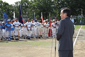 第97回(平成19年度秋季)磯子区少年学童部野球大会の開会式典が洋光台南公園少年野球場で盛大に開催されました。私も来賓としてお招きいただきました。恒例の入場行進は前回優勝のエスパー(屏風ヶ浦)、準優勝リトルバイキングズ(洋光台)、第三位屏風ヶ浦クラブ(屏風ヶ浦)を先頭に合計21チーム478名の皆さんの大行進でした。私からは昨日できなかったことが今日は出来たといった感動を求めて頑張って、と激励しました。