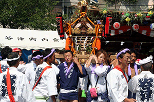 谷津浅間神社のお祭りです。お祭りの賄などは町内会の女性の皆さんが主役、男性群は力仕事と神輿が担当。上手に、しかも助け合いながら皆さんが町を盛り立てています。私はお赤飯とお神酒をご馳走になり、神輿の出発を見送りました。