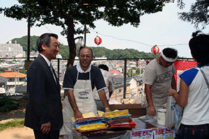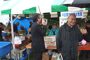 中区の区制80周年記念のハローよこはま2007の開催式典にお招きいただきました。会場は根岸森林公園です。お天気なら大勢のお客様でごった返す筈だったのですが、今日は本降りの雨でした。そんな中でも開催式典は実施され、私も紹介を受けました。その後、各テントに激励に伺いましたが、この雨では模擬店の売り上げもあきらめ顔でした。早々に店じまいのところもありましたが、皆さんのご尽力に敬意を表します。本当にご苦労様でした。