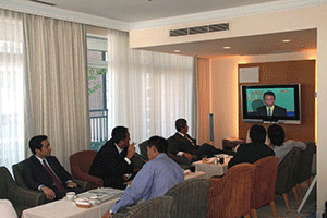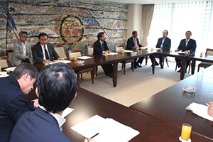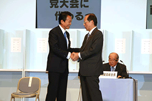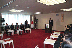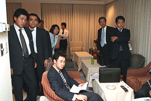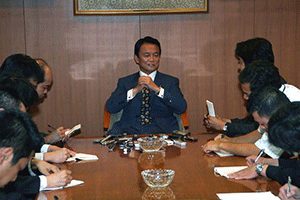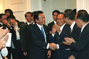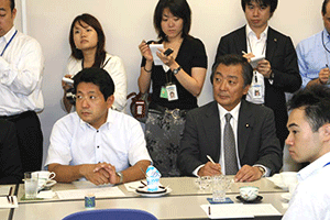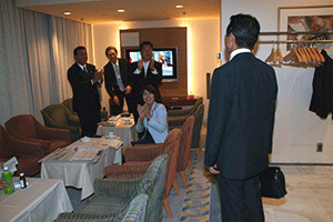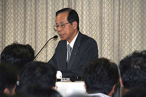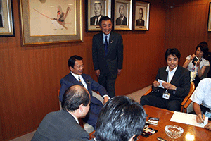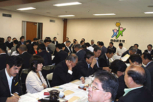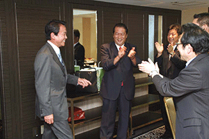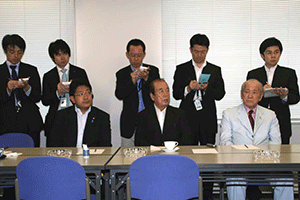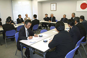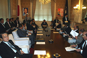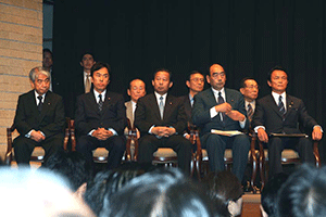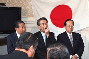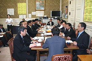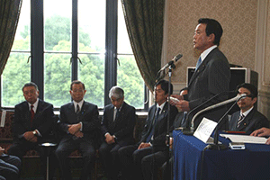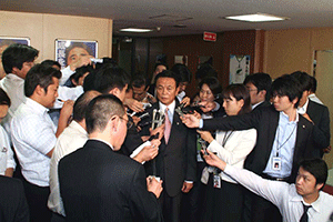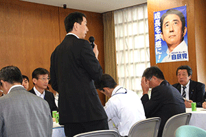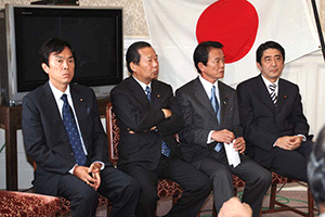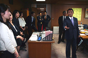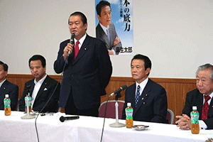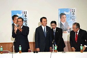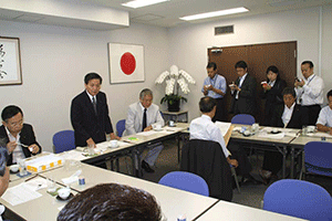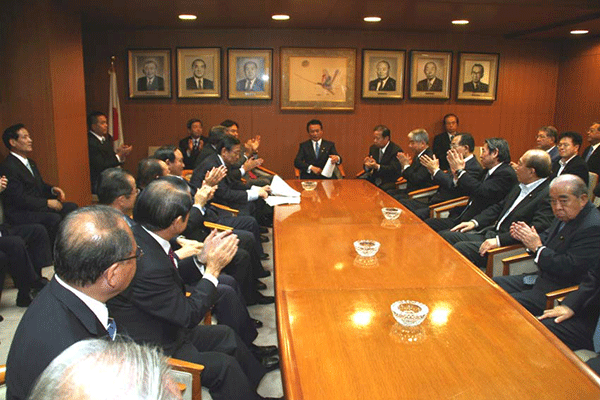 麻生太郎幹事長は「とにかく明るく。参院選大敗からずっと暗い。そんなに暗かったら蛾も寄って来ない。私も明るく振舞い、みんなが寄ってくるようしっかり幹事長室にいるようにする」旨の挨拶から始まり、地方組織の建て直し、国会衆参ねじれ現象対応、政治と金問題対応について取り組んでいくことが述べられました。さらに細田幹事長代理は、さらに幹事長室の機能アップに向け副幹事長の皆さんからたくさんの提案や意見を受け止めました。