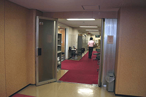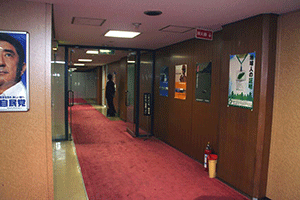 正面(写真中央)突き当りの左側が幹事長室(写真左)、右側が記者クラブ(写真右)