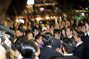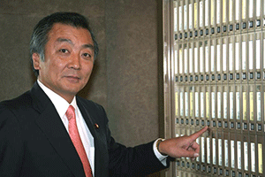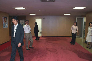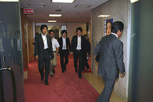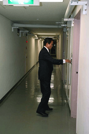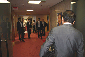 そんな様子に見かねて「一日中椅子に座っているような無駄な時間を使うな。私が出るときをブザーかチャイムで合図をおくる仕掛けを考えろ」との幹事長指示により、幹事長室の外側壁にチャイムが設置されました。そして、幹事長が部屋を出発するときに秘書が内部でスイッチを押すことになりました。今日はそのお披露目です。官邸に向け出発する幹事長が幹事長室を出る瞬間に「スイッチ・オン」。小学校のチャイムのような音でしたが、それが鳴るといつもの 二倍近い記者さんらがいっせいに飛び出してきました。さて、うまく取材はできたのでしょうか?それは不明です。