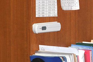そしてチャイムを鳴らすスイッチは左の写真のちょうど中央、小幡都さんの右手にセットされています。