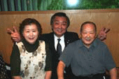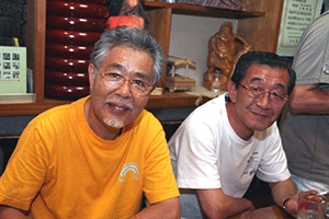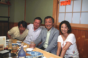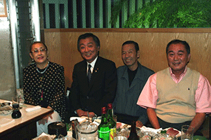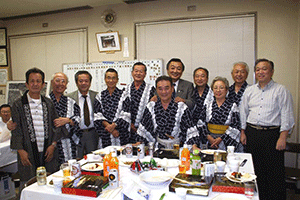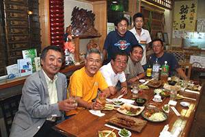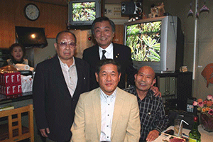 えびす会の会長は中央の沖安之助さんです。このえびす会は学生時代、仕事仲間などによる懇親会で数十年続いているらしいのですが、それだけに様々な経歴を持った皆さんがメンバーになっています。沖会長の仕事は運転手さん。しかも堅気の・・・。でも服装の趣味や見た感じはまるでその業界の方のように見えます。電車に乗ると周りのお客さんが席を空けてしまうそうです。人は見かけが9割といわれるだけに、よく知ってみると「人は見かけによらぬもの」と逆の理解になります。ほんとに人の良い、やさしい会長なんですよ。