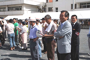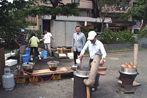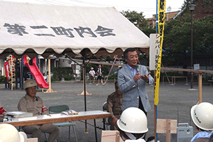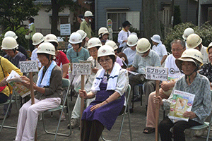 中区の訓練を途中で抜けて磯子区の丸山第2町内会の防災訓練に向かいました。一つの町内会できめ細かい防災計画が立てられているようです。今回のメインテーマは家屋倒壊、特に家具の地震対策についての講話です。それが終わると三箇所にある消火栓とホースの点検、そして炊き出し訓練へと移るそうです。この町内会の炊き出しは「そうめん」です。出来上がったそうめんを樋を利用して「流しそうめん」にし、皆さんが同時に食べることが出来るように工夫されています。