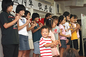 次は駆け足で金沢区の瀬ヶ崎西部町内会の恒例の敬老会に伺いました。毎度のことですが、女性の皆さんの心のこもった手料理やお弁当でテーブルの上は一杯です。現在70歳以上の方が255人、そのなかで90歳以上の方が25人(男性8人、女性17人)いらっしゃるそうですが、それだけに会場には入りきれないほどの参加者でした。食事と共に演芸大会が始まりますが、トップバッターは子供会のみな案でした。リコーダーによる「少年時代」の演奏でしたが、息の合った演奏と笑顔のカスタネットが皆さんを和ませてくれました。