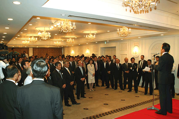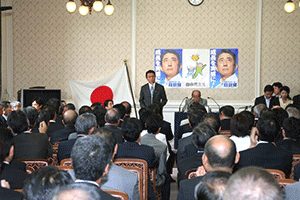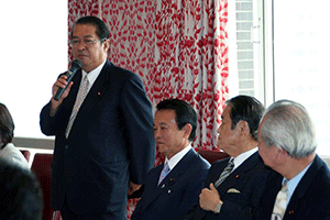 今日は正副幹事長の、まさに結団式、そして懇談を通じて相互理解を深めるための会合が都内の料理屋で開催されました。司会は林幹雄筆頭副幹事長で、早速元気一杯の麻生太郎幹事長から挨拶をいただきました。このホームページをご覧の皆さんは幹事長の考えを既にご承知のことと思いますが、幹事長はいつもの通り、