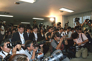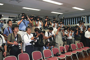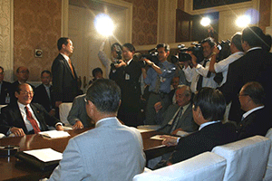 自民党本部の4階は、エレベーターを降りると、目の前の廊下左側が総裁室・幹事長室。そして右側には記者さんらのスペースが広くとられています。その記者さんらの仕事は、もちろん総裁や幹事長の発言を得て記事を書くことです。いつ幹事長に接触するかといえば、定例記者会見などのほかに四階から一階へ移動する間に一言発言する言葉も大切な材料です。そこで、彼らはどんな構えでそのチャンスを待つかといえば、幹事長室での仕事がいつ終わるか分かりませんから、幹事長が部屋から出てくるのを長時間椅子に腰掛け見張っていなければならないのです。幹事長が部屋から出てきた途端にたくさんの記者さんがいっせいに駆け出してきます。そして幹事長を取り囲み、質問をぶつけてくるのです。しかし、いつ幹事長室を出るか予測は難しく、記者さんの中にも出遅れてしまう人もいます。