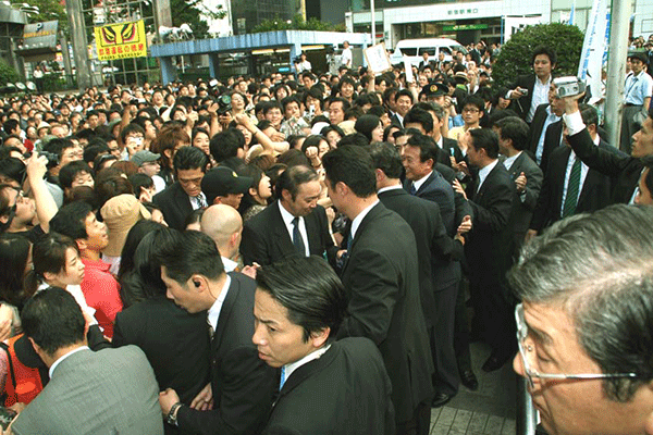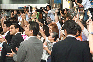 麻生太郎幹事長が幹事長室を出発する時にチャイムが鳴らされます。すると正面の記者クラブから大勢の記者さんが幹事長を追いかけ、歩きながらの取材を行います。