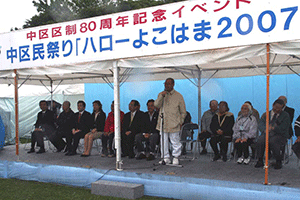 横浜には18区がありますが、最も早く区制を立ち上げたのが鶴見区、神奈川区、保土ヶ谷区、中区、磯子区の5つの区でした。それぞれが80周年を迎え、各区はそれを祝うさまざまなイベントを企画しています。今日は磯子区が区制80周年を祝う記念磯子まつりが開会されました。杉田にある東芝グランドに設置されたステージに磯子区の子供たちが音楽を奏でたり、模擬店がでたりして80周年のお祝いムードを盛り上げています。私は式典にお招きいただき、しばしの間皆さんとの交流を楽しみました。