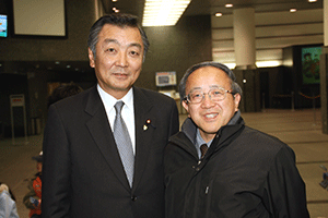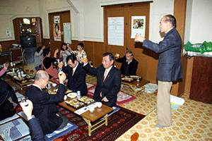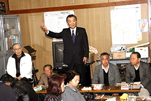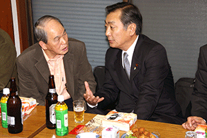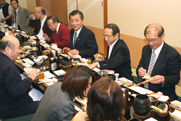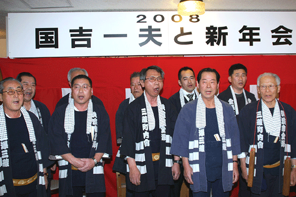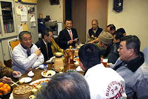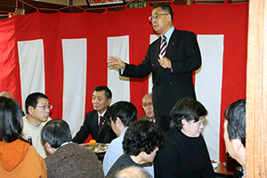 金沢区の西大道の新年会と同時刻に開会されていた中区末吉町3,4丁目の新年会に遅れて到着しました。すでに式典は終了し、皆さんのお酒や食事はだいぶ進んでいるようでした。短い新年の挨拶をさせていただきました。すると杉本商和会会長から「犯罪の 時効を無くせ。仕事をしない公務員は首にしろ。島が沈む報道を見て涙が出たが、地球温暖化対策を急げ」と注文を頂きました。悪を追放し100%善の国づくりを求められましたが、私からは理想と現実の両方に目を向けていかなければならないのだろうと応えました。その後、二次会のカラオケもお付き合いし、菊池正綱会長の見事な歌声に聞きほれました。時間に気がつくと終了は午後10時を回っていました。