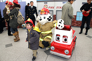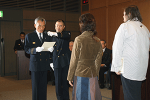 恒例の中消防出初式が横浜情報文化センターで開催されました。主催者挨拶、表彰、来賓挨拶と続きました。表彰されたのは消防功労表彰、消防署長表彰、消防団長表彰などで、被表彰者が表彰状を受け取りました。また一階会場では防火ポスターの表彰が成され、最優秀の福田朱歌さん(大鳥小学校2年)はじめ18名が表彰されました。屋外では木遣・纏の演技、消防署・消防団によるデモンストレーションが行われました。子供たちはお土産のヘルメットに大喜びでした。なお中区の平成19年の火災件数は92件で昨年より3件減っています。その原因は放火、たばこ、食用油過熱出火、火遊び、こんろの順に多かったそうです。
