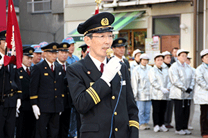 引き続き、加賀町消防団では独自に山下町公園で恒例の出初式が開催され、国旗掲揚、開式の辞、状況報告、観閲、団員表彰、来賓祝辞、団長謝辞、演技と続きました。私からは、現在全国で100万人の消防団員を目指しているのに関わらず90万人を割り込む状況、加賀町消防団も120名の目標に数名足りないところにあるそうですが、概ね目標を達成し、熱心に活動を続けられていることに敬意を表しました。