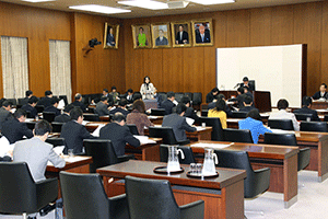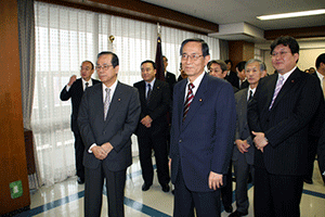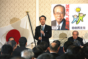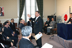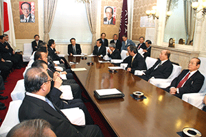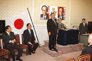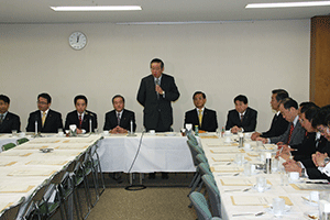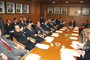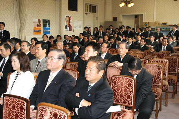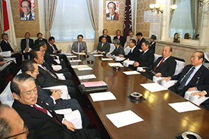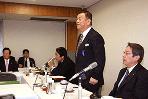 年を明け衆参ねじれ現象の中で予算審議を行う未経験の国会がスタートするが、自民党らしくどうどうと王道を歩んで欲しい。またアセアン諸国は日本に対しての期待が大変大きいと福田総裁からの話が報告されました。そして年明け国会の動きについて衆参国対・議運から報告がなされました。古賀選対委員長からは各級の選挙が始まるが、それぞれに努力することが総選挙にも資する旨の心構えが述べられ、谷垣政調会長からは政策の分かりやすさに心がけるとの報告がなされました。そして細田幹事長代理から党大会の概要について報告がなされました。