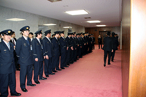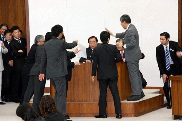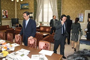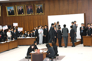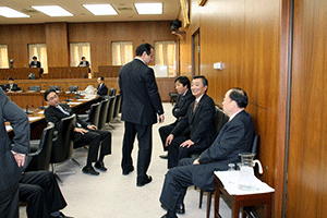 副幹事長は、今朝8時までに国会議事堂衆議院内の幹事長室に集合するよう幹事長から指示がありました。昨晩は夜遅く、またホームページの更新など自宅事務所で処理すべきことが山積していて、ほとんど睡眠時間を取れないまま10分前に到着しました。到着すると林幹雄筆頭副幹事長から私は総務委員会の委員室に入り様子を報告するよう指示を受けました。これは昨日ガソリン値下げ隊の議運理事会室封鎖事件によるものです。予定されている開会時間は午前9時30分ですが、早々と委員室に入り様子を見守ります。その委員室の外は衛視の皆さんに守られています。
