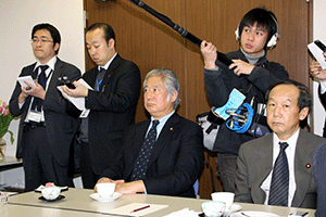 いつまで待っても本会議のベルは鳴りません。すると与野党が両院議長のあっせんあんを受け入れ合意されたとの情報が飛び交い、いったいどうしてしまったのか大騒ぎになりました。その経過・結論について伊吹文明幹事長、大島理森国対委員長から説明と取り組みに対する感謝の挨拶がありました。結論は「つなぎ法案」の取り下げです。