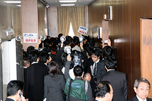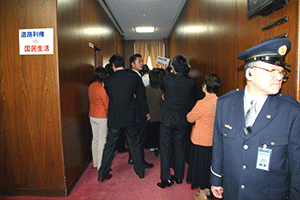 党本部での仕事を終えて、衆議院に戻りました。まだ総務委員会は開かれていませんでした。しかし、それからしばらくすると、周辺が騒がしくなってきました。理事会室付近をガソリン値下げ隊が取り囲み、理事会の開催の阻止を図っているようです。