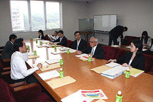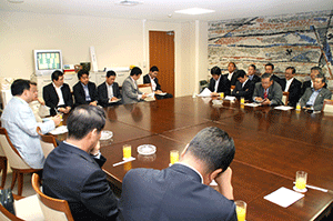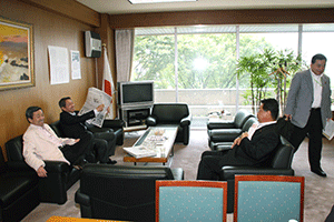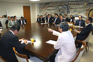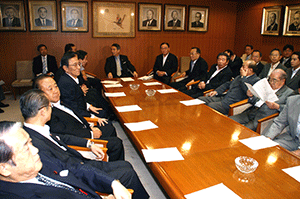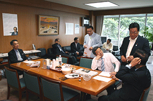 駅頭活動が終了するとただちに永田町に向かいました。自民党本部の幹事長室に到着すると伊吹幹事長はじめ役員や副幹事長の皆さんが既に集合していました。総裁応接室に場所を変えて役員連絡会の開会です。伊吹幹事長からまず福田総裁からの伝言が伝えられました。その内容は、@今日から税制調査会がスタートする経済等状況の変化があるときで準備を入念に行って欲しい、A無駄ゼロに向けた取り組みはその中間報告を出すが、内容は不十分であり、党内でもしっかり議論して欲しい、Bサミットの準備は万端、留守にするがどうぞ宜しく、との要旨でした。井上信治青年局長からは6月29日に青年局の全国一斉街頭活動が行われ、拉致問題、環境対策、民主党の無責任批判を行ったことが報告されました。