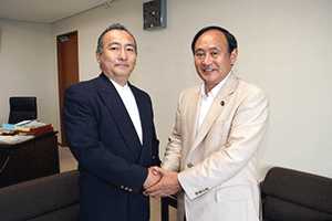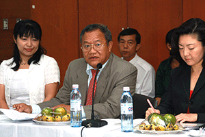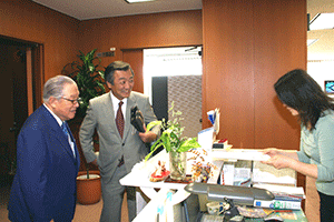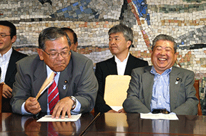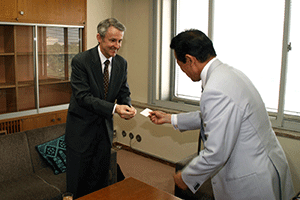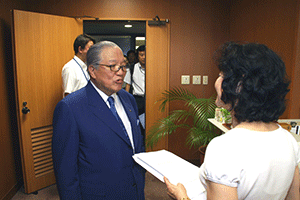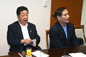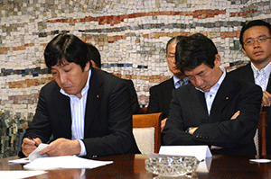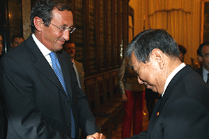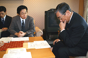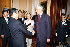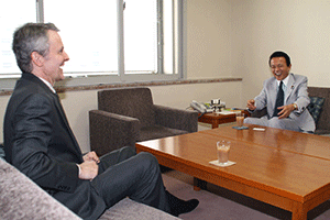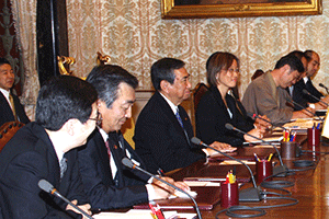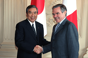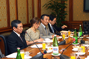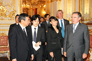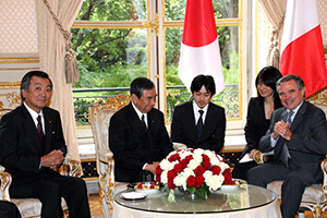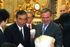 また9月に広島で開催されるG8下院議長会議に早速出席のご返事をいただき誠にありがとうございました。アコワイエ議長には冒頭に基調講演を頂きたいと考えており、今日はそのお願いに参りました。我々人類はエネルギー、食糧、経済など様々な分野で問題を抱えています。長期的な問題解決を考えれば、G8で環境問題を取り上げたなら、我々下院議長会議では平和・軍縮をメインテーマにしたいと考えました。そのため会場は60年前に世界で唯一の被爆国となった我が国の広島を選びました。二度とこのような悲劇が起こらないよう、広島・長崎の被爆を地球上の最後にしたいのです。