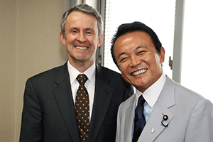今日の麻生太郎先生の活動は、表敬、情報収集、勉強会などの会合が目白押しです。面談の様子を見に行ってきました。10年ほど前に私も面談した、当時駐日米国大使館主席公使であったクリストファー・ラフルアー氏(宮澤喜一元総理の娘婿)が表敬訪問にお越しです。麻生先生が別会場から到着されるまで私がお相手。2004年〜2007年まで駐マレーシア米国大使を務めていましたが、今年3月からJPモルガン証券株式会社の副会長に就任されたことを麻生先生に報告する表敬訪問でした。私とのおしゃべりの中で、米国の社会保障制度のあり方について質問したところ、国民各個人だけでは対応しきれないため、日本のような国民会保険制度を導入する方向で議論が積み重ねられているようでした。麻生太郎先生が到着されると、議論はアジア経済について熱心な情報交換が行われました。