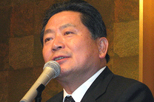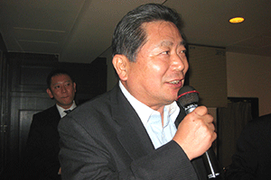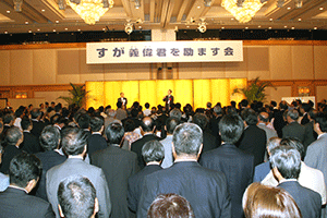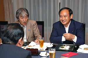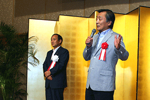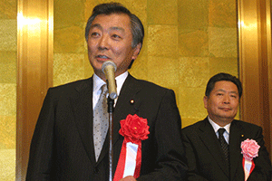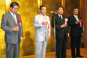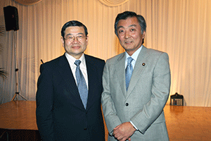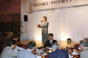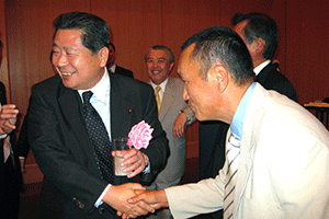「官僚国家の崩壊」と題した講演が終了し、第2部の懇親会に大勢の皆さんが移動してきました。お話の中では、後期高齢者医療制度への批判、怒りは官僚により自尊心を傷つけられたことへの国民の怒りであるとし、無神経な国家運営に警鐘を鳴らしたそうです。第2部での懇親会では主催者の岩崎学園理事長の主催者代表挨拶に続き、中川秀直先生からはお礼の挨拶、そしてお招きいただいた奥野信亮先生と私から祝辞を述べました。乾杯後、中川先生は会場を丁寧に回って、参加者の皆さんに一人ひとりお礼を伝えていらっしゃいました。
