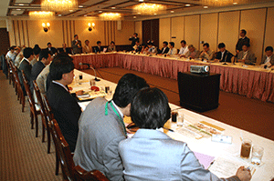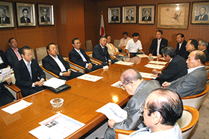 役員連絡会が終了した後、引き続き副幹事長会議が細田博之幹事長代理のもと開催されました。閉会中のため、また外遊中のために副幹事長の出席はいつもより少なめでした。役員連絡会でも議題になった原油高騰対策についてはより具体的な対策を示すことが出来るよう、さらに検討を続けること、またジュネーブで開かれているWTO農業交渉の結果についてはまだ分かりませんが、平常心でそれらの結果を待つことになりました。