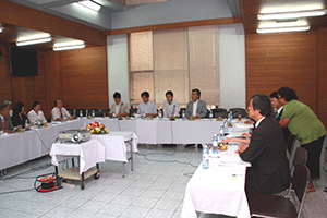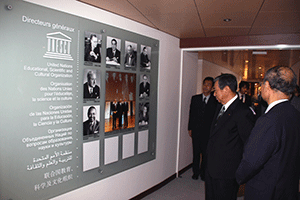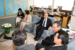 ユネスコ本部は改修中で内部は工事現場のような状況でしたが、それぞれの機能は動いています。松浦ユネスコ事務局長にお招きいただき、事務局長室で現在の取り組み状況などについてお話を聞きました。 ユネスコの活動については理念は理解されつつも具体的な活動になると米国などのように協力を得られないケースもままあるようで、反ダンピング法について批准しないと米国へのオリンピック誘致に反対すると訴えると、あわてて米上院は取り組むといったような有様だそうです。これからは、経済水域の水中文化財の保護などが問題になってくると思われ、中国との関わりが懸念されるなら日本も早く対応しておくべきだとの助言も頂きました。そして「富士山の世界遺産登録」については、ゴミ対策だけでなく、周辺の開発が進みすぎたこと、自衛隊を別のところに移転できるかなど全体的な景観保全が重要な鍵とのことでした。さらに、教育問題にも触れられ、世界中で頭を痛めているのがこの問題だそうで、松浦事務局長は自論として、明治維新では33%もの教育予算をかけていたことを考えれば現在でも20%以上の予算を計上すべきではないかとのご意見でした。
