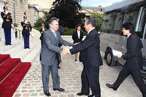 目的は日本で9月に広島で開かれるG8下院議長会議の基調講演の依頼や出席要請です。そのために、フランスではシラク前大統領との懇談、アコワイエ国民議会議長との懇談、イタリアではフィーニ 下院議長との懇談、カジーニ前下院議長との懇談、ディーニ上院外務委員長との懇談等々たくさんの会議がセットされています。随行するのは自民・公明・民主・共産から一名ずつの代表議員と事務局・SPなど10名になります。 |