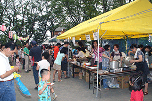 洋光台6丁目でもまだ盆踊りは始まっていませんでしたが、もう少し暗くなると賑やかに踊りの輪が出来ることだと思います。ここでも多くの子供たちが模擬店に並んでお父さん、お母さんにお目当てのものをおねだりしていました。