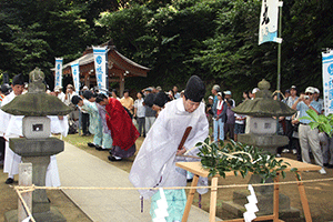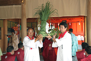 富岡八幡宮の例大祭に出席しました。昨日柴の熊野神社の例大祭で佐野宮司とお目にかかり、是非来て欲しいとのお話があり、今日は手子神社と二ヶ所の祭礼が重なってしまったのですが、富岡にお邪魔することになりました。昔から麦の豊作を祈念するお祭りと、茅の船に収穫した麦をのせ海の神に贈ると共に厄払いを行う祇園舟の神事が一緒に行われます。茅場が減って青々とした葉っぱを入手するのが困難になっているそうです。