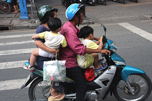 ホーチミンもオートバイであふれています。大人はヘルメットが義務付けられているようですが、子供はノーヘル。
