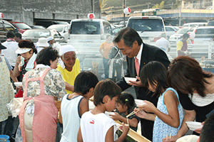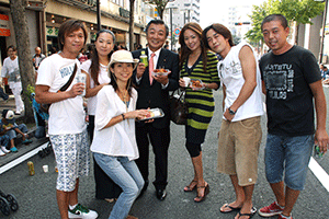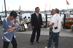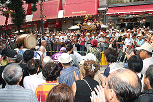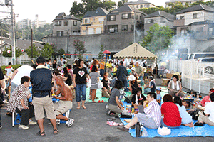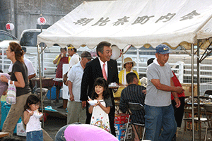 今度は金沢区へ移動です。三艘町内会の役員や子供連れの皆さんが勢ぞろいです。浅間神社の祭礼が行われ、神社境内や周辺には模擬店が並び子供たちは大喜びではしゃいでいます。
