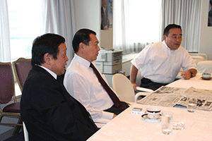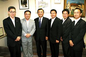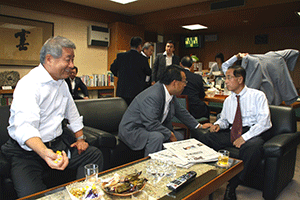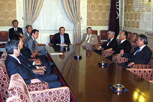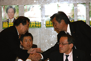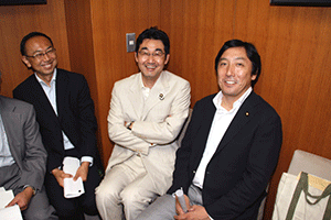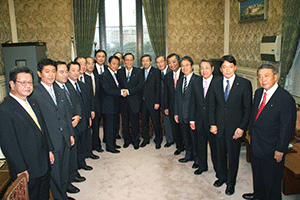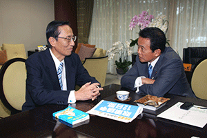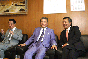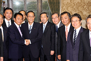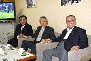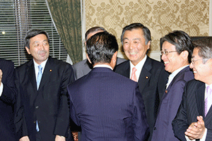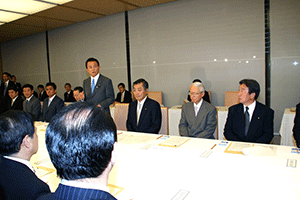 麻生太郎新総理大臣が本会議のお礼挨拶に幹事長室を訪れました。副幹事長の皆さんとともにお迎えしました。麻生総理は細田新幹事長としっかり握手をされ、これからの闘いにともに歩むことが誓われました。