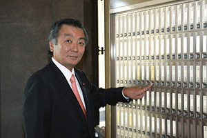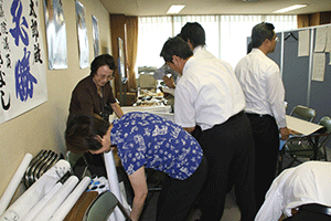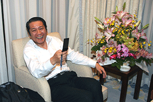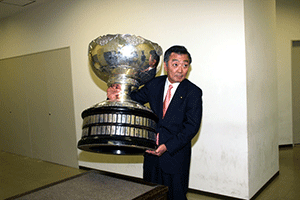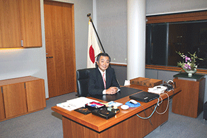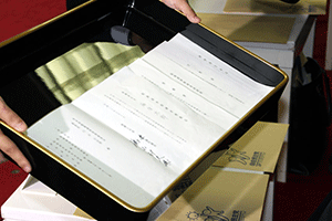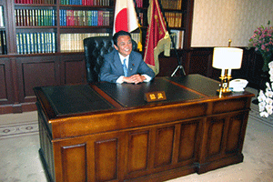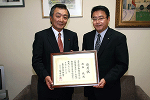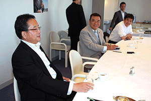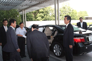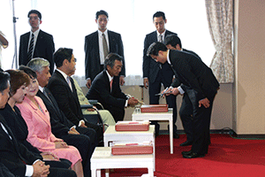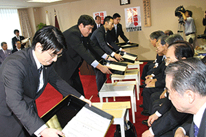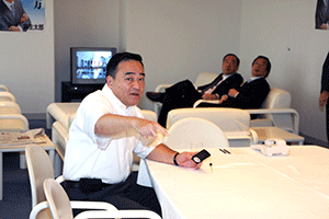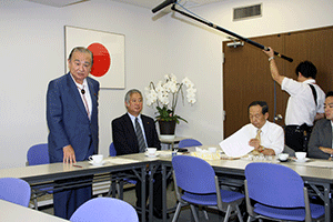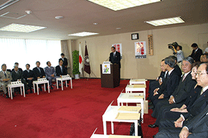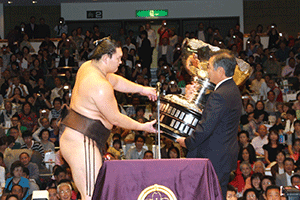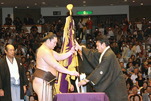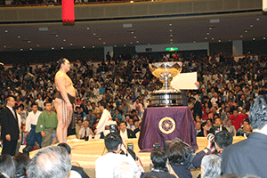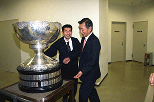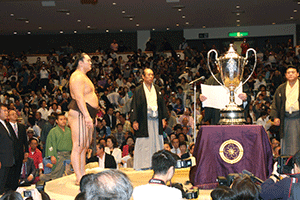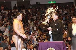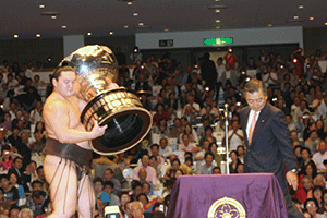 国技館に到着し、財団法人日本相撲協会の武蔵川晃偉理事長にご挨拶した後、事前に表彰状の内容を確認。そして総理大臣杯を持ち上げて見ました。手をかけるところを間違えなければうまくいきそうです。