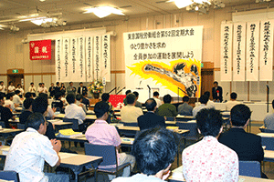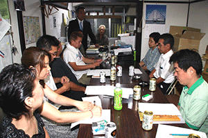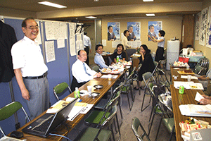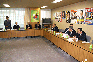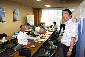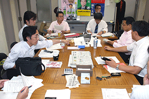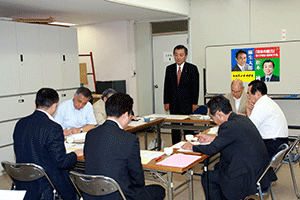 為公会選対が開催され、事務局より現状の報告がなされ、担当責任者ごとの打合せに入りました。活気のある選対事務所になっています。