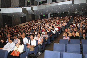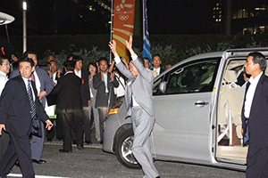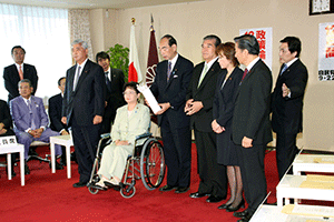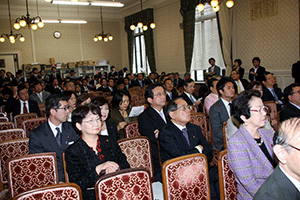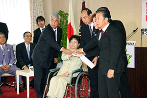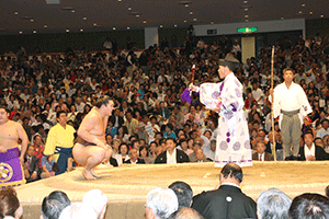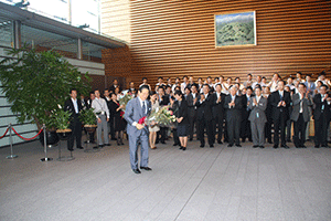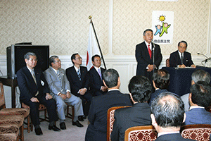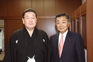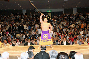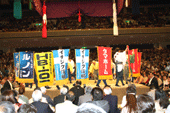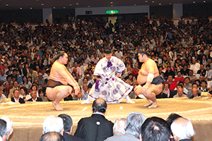 昨日八回目の優勝を決めた白鵬に内閣総理大臣からお預かりした表彰状を読み上げ、授与しました。そして総理大臣杯を渡すことになりましたが、足元はスリッパで滑りやすい。また杯を持ち上げるまで介添えが支えてくれるのですが、持ち上がった途端に手を離して下がってしまうではないですか。いきなりズシンと重くなった総理大臣杯をしっかり抱えて、なんとかお渡しすることが出来ました。会場の様子は満員御礼でたいへんな熱気でした。国技としての相撲がすべての国民から愛されるよう、益々の発展を祈りました。