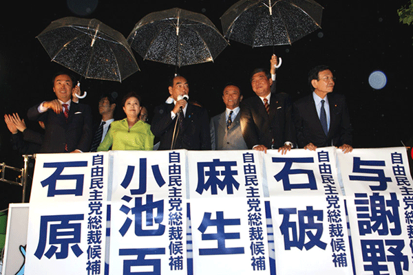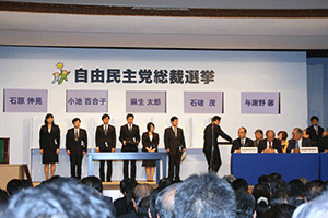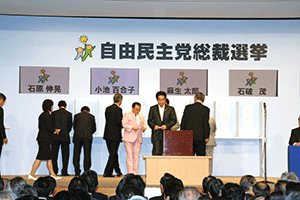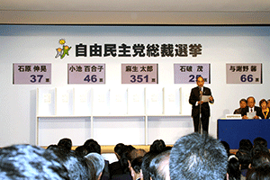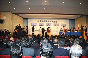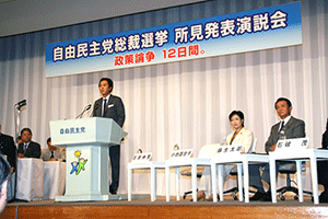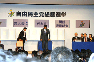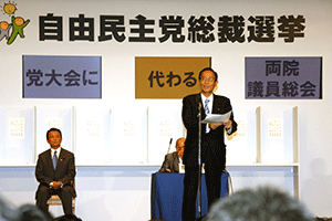 緊急役員会が行われました。今日の会議の目的は麻生太郎幹事長が総裁選挙に出馬するため、幹事長職から離れる手続きです。代行として細田博之幹事長代理に幹事長権限を委嘱することが承認され、その報告が記者会見でなされました。この意味は、行司役としての幹事長は、優位な立場のまま自分の総裁選挙立候補活動を行うことが出来ませんので、この手続きによって、晴れて候補者としての動きをスタートさせることが出来るのです。これから本格的な総裁選挙活動がスタートします。