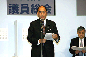 両院議員総会で麻生太郎総裁、細田博之幹事長から挨拶がなされ首班指名に臨む心構えが伝えられました。そして参議院議員は退席し、引き続き代議士会が開催されました。大島理森国対委員長から今臨時国会の意義・取り組み姿勢について挨拶がなされました。