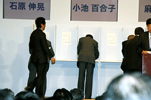 今日の本会議の目的は首班指名で、総理大臣を決定することです。まず一回目の本会議で投票用紙に「麻生太郎」と書いて投票します。その結果は、投票総数478のうち麻生太郎君337、小沢一郎君117、志位和夫君9、綿貫民輔君7、福島みずほ君7、平沼赳夫君1、でした。次に参議院で同じように投票が行われますが、その結果は小沢一郎君が一位で選出されました。衆院、参院で違う結論が出ましたので両院協議会が設置されることになります。その為に二回目の衆院本会議が開催され両院協議会の設置が諮られました。両院協議会で審議された結果、意見の一致を見ませんでしたので、三回目の衆院本会議が開催され、その報告がなされ、一致を見なかった場合の処理により、衆院の結論を国会の結論にすることになります。そこまでの手続きを済ませて、晴れて「麻生太郎新総理大臣」が誕生しました。