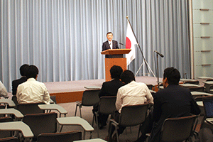 官邸の閣議室に一番乗りで到着し、今日の議題について事前に確認しました。麻生総理が国連総会に出席しているため、河村官房長官が総理の代理として閣議がスタートしました。麻生総理の国連総会での演説での様子を報告されました。それによると、麻生総理の演説がスタートする前に「でき立てホヤホヤの総理です」と英語で自己紹介してから演説に入ったそうですが、その瞬間会場からドッと笑いが起きたようです。また演説途中で通訳の機械が故障し、再度演説をやり直すというハプニングもあったそうです。その際麻生総理からは「その機械は日本製じゃありませんよね」といったコメントが発せられ、再び会場は爆笑のうずだったそうです。また閣僚に失言について、国民の皆様から誤解を受けるような発言をしないよう官房長官からご注意がありました。