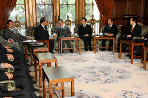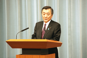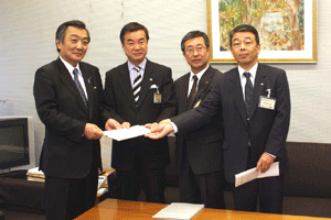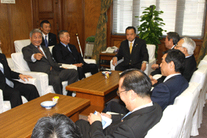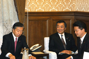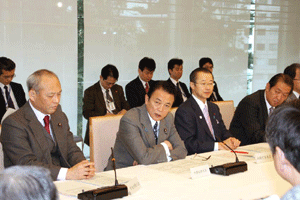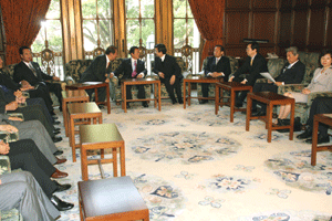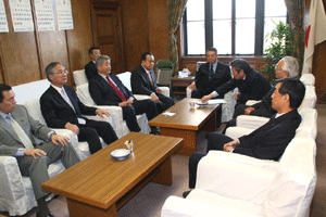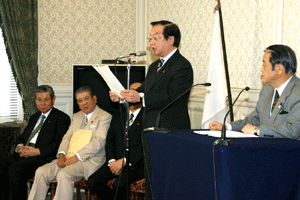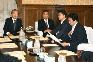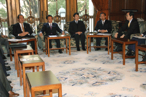 神奈川県の松沢知事と愛知県、大阪府の知事代理が来訪され、「地方分権の推進に向けた提言」を総理の代わりに受けさせていただきました。その概要は、1.国から地方への事務・権限の委譲について、2.国の出先機関の見直しについて、3.地方自治体の自主性の強化と自由度の拡大について、4.地方税財政制度改革について、の四本の柱によるものでした。