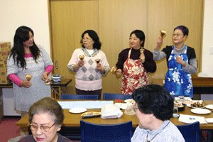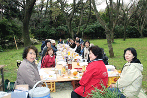 新たに完成した町内会館で初めて開催されたお花見会にお招きいただきました。皆さんと乾杯し、皆さんの健康と町内会の発展を祈りました。町内会の「爽やか隊」の皆さんによるハンドベル演奏を聞かせていただきました。
