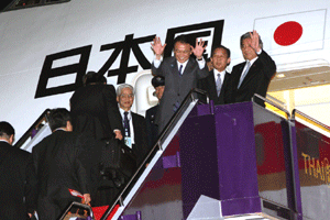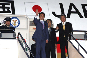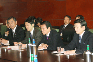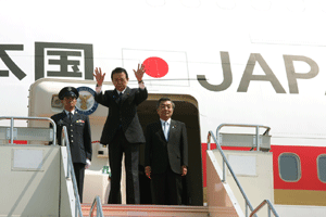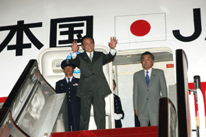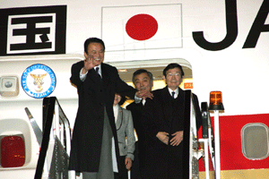 今回は、麻生総理とは空港で合流することになっていますので、横浜の自宅から空港へ向かいました。空港に先乗りして麻生総理をお迎えし、北京に向かって政府専用機で出発しました。北京首都空港までは3時間45分という非常に短時間のフライトでしたが、今日は早速、温家宝総理との会談がありますので、時間を惜しんで会談の事前準備に努めました。