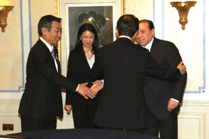 日・インドネシア首脳会談が終了した後は、イタリアのベルルスコーニ首相との会談に臨むため、イタリアが宿舎としているクラリッジズ・ホテルに移動しました。会談は、再会を祝した両首脳の笑顔での抱擁から始まり、終始非常にうち解けた雰囲気の中で行われました。会談では、世界経済・金融問題や国際情勢について、議論が行われました。ベルルスコーニ首相からは、日本の大規模な経済対策に対する評価と歓迎が表され、また、パキスタン支援に関する日本の主導的な取り組みに対して評価が示されました。